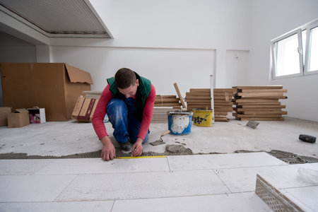 Skilled Worker Installing The Ceramic Wood Effect Tiles On The